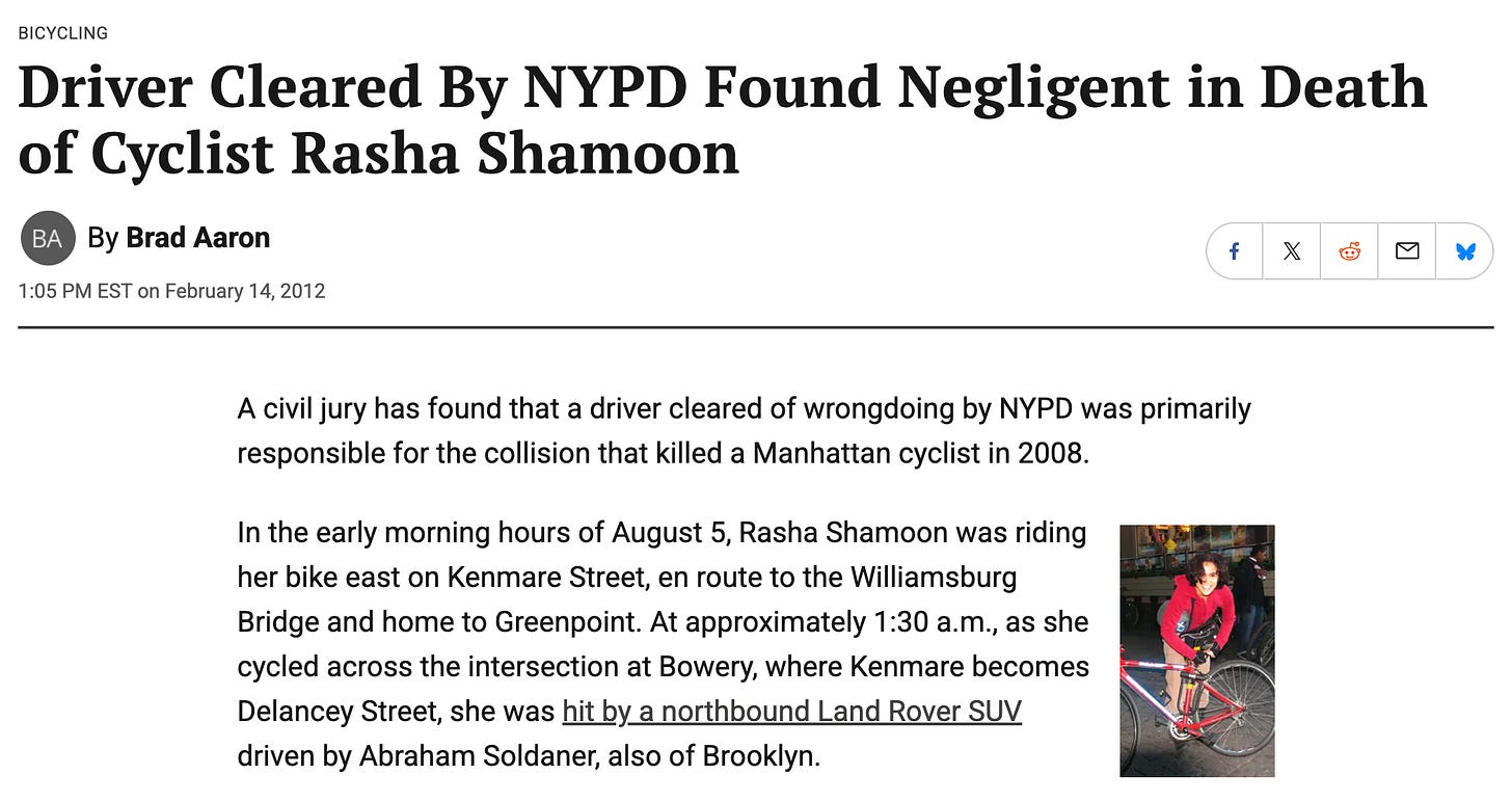I maintained a database of fatal crashes, with details on attendant criminal court cases, which I reported on in the extremely rare instance a motorist was charged, or even ticketed, for killing someone.