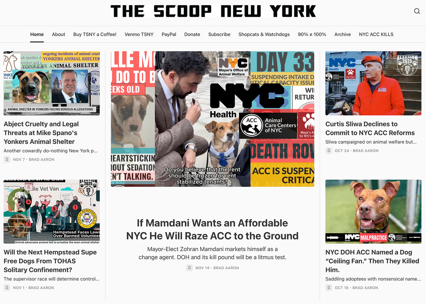 A news site/newsletter platformed on Substack, like JAMESTOWNY, TSNY covers the intersection of New York politics and companion animal welfare statewide — from Buffalo to Brooklyn, as the tagline says. The Scoop New York (subscribe today!) gained non-profit status in early 2025.